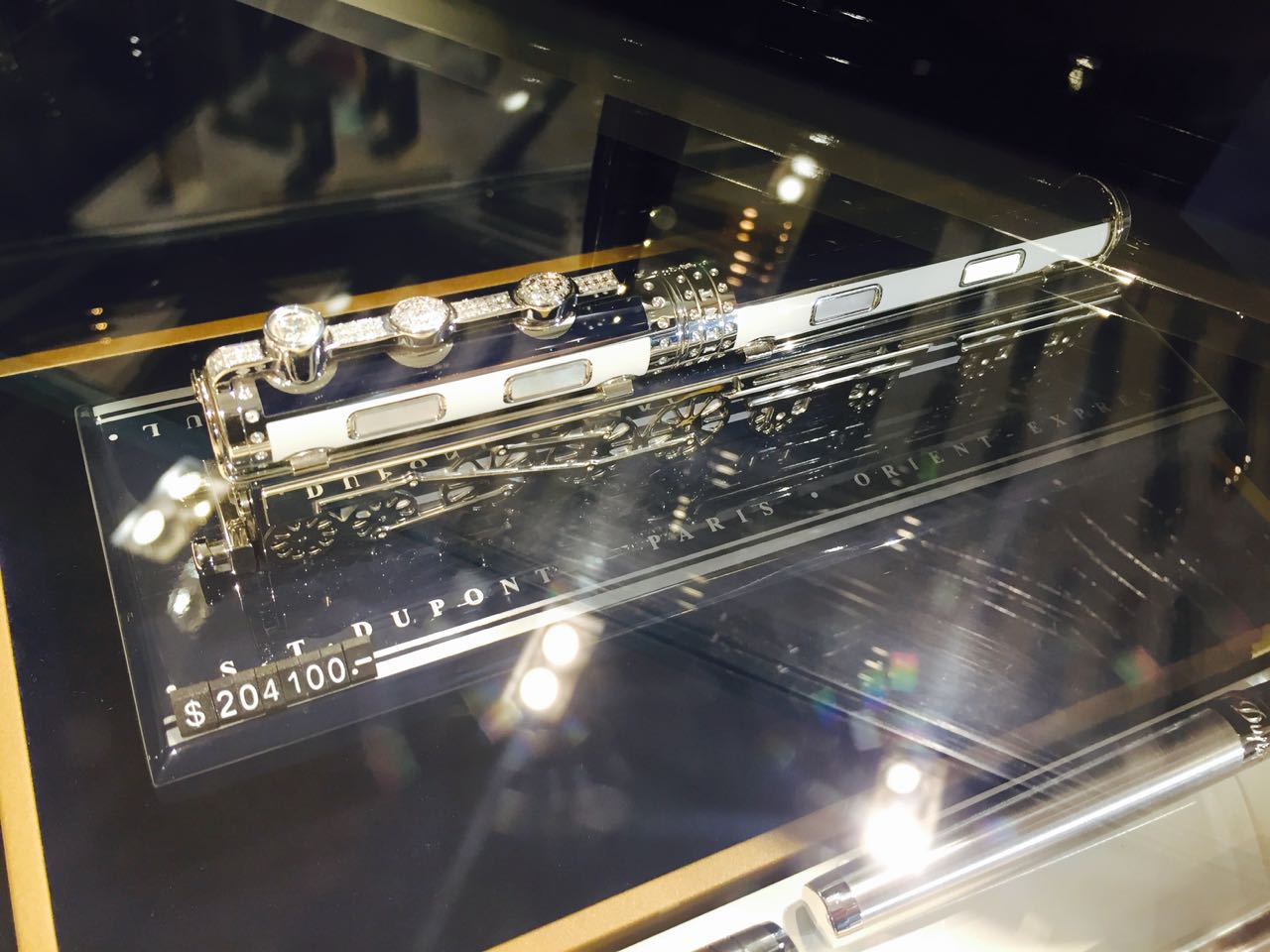 Look at this pen I saw at a S. T. Dupont store, Central, Hong Kong. It is a jewell encrusted train, limited edition, pen. The price is A$34,000.