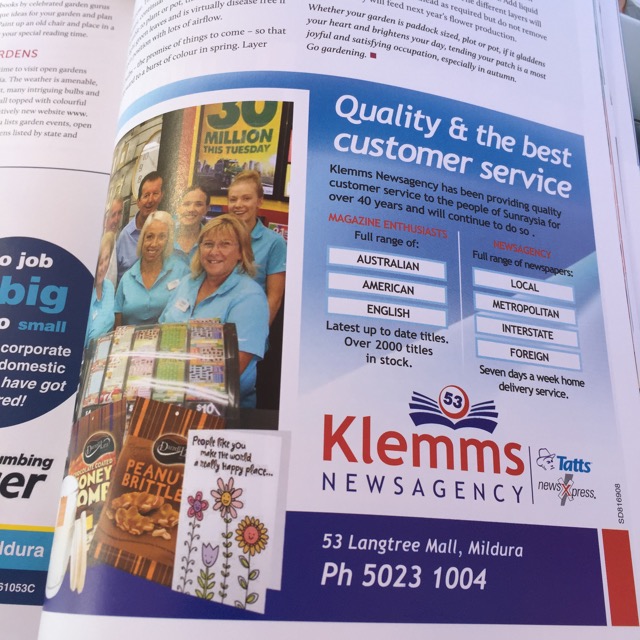 Check out the ad being run by Mildura newsagent John Klemm in a glossy magazine being widely distributed in the area. I like the ad because it pitches quality and customer service in the headline and then focussed on magazine enthusiasts and also pitching a strong commitment to newspapers. It is rare to see such a commitment to print.