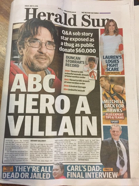 I stopped buying the Herald Sun years ago because of this sort of gutter press. They were always sensationalist even back in the days of The Sun but in the last few years its news reporting particularly on politics has hit rock bottom with its cartoon-like front pages etc. I now have no time for that paper or any News Corp venture and that includes news.com, Foxtel.