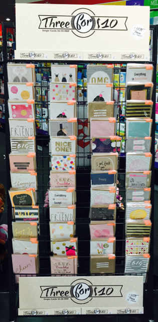 Here is what we are doing on the lease line with the Hallmark BUY 3 FOR $10 card offer. It is the type of stand you might expect to see in a Typo or kikki.K yet here it is in front of a newsagency, promoting cards on the lease line, attracting card shoppers who might otherwise have walked on by.