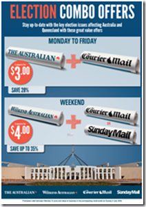 News Corp has a bundled shopper offer with capital city titles and The Australian to run from June 13 for three weeks. While I have only heard about about this out of Queensland, the company pitches these nationally.