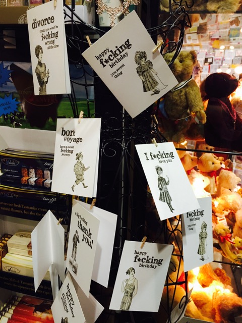 This photo shows one such move with cards. We have pegged a range of naughty cards to a black wire-frame mannequin. We felt this stand was an appropriate host for these cards as it plays against the naughtiness of the text.