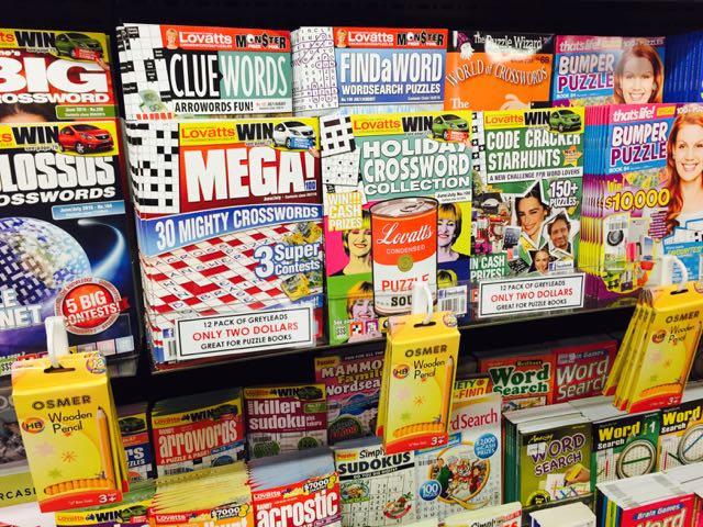I love the tactical placement of the $2.00 pack of grey-lead pencils with crossword titles in my newsagency at Southland in Victoria, by the manager of the store. Pencils are a perfect add-on to a crossword purchase. The placement does not get in the way of crossword titles.
