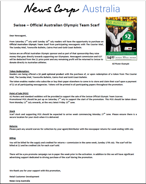 News Corp. owes newsagents an explanation about their commercial terms with Swisse. Newsagents need to be told how much News Corp is charging Swisse so we can better understand the request that we do our bit for 5%. Without this, it is open to speculation that small business newsagents are being exploited by News Corp. and Swisse, that our contribution is greater than either News Corp and Swisse in terms of the value being delivered to the olympic team.