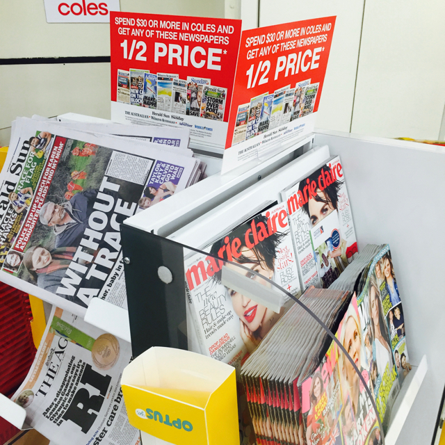 I like the signage promoting the half-price newspaper offer in Coles. Placed directly above newspapers and magazines on the stand usually at the entrance to the supermarket, there is no missing this offer.