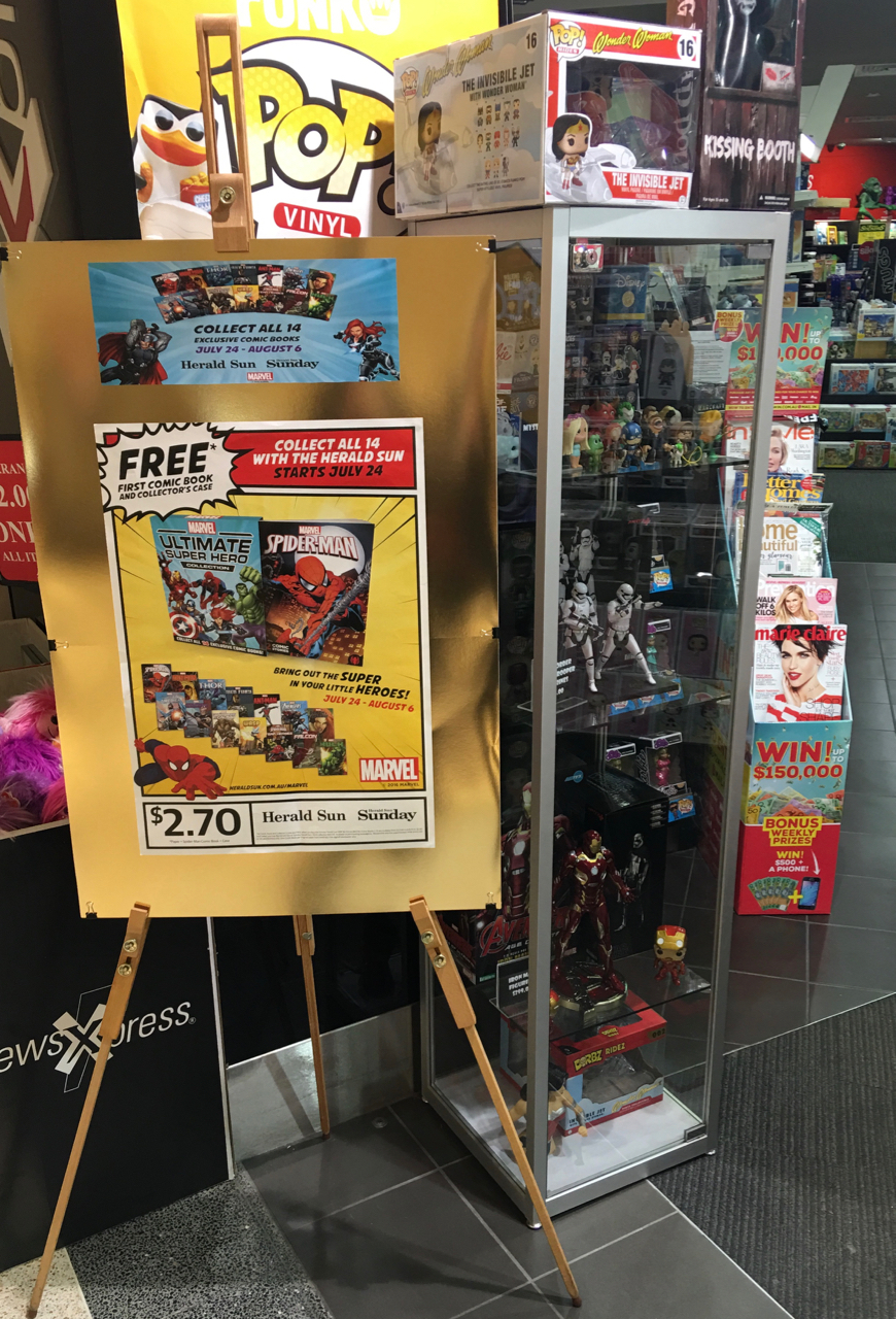 Here is how we are promoting the News Corp. Marvel offer at the front of the newsagency on the lease line. While the display is nt as big at the publisher would like, it is in the very best position for eyeballs, the the front of the shop and next to a stunning display of Marvel licenced products, most of which you cannot see in the photo.