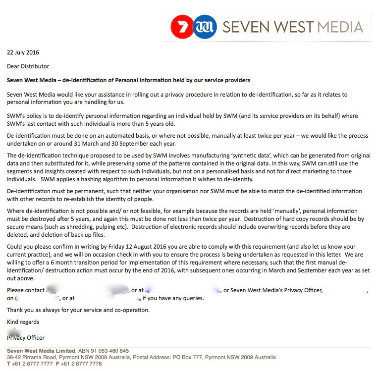 Home delivery newsagents in Western Australia last week received a letter from Seven West Media seeking their commitment to de-identify customer records from customers who lapsed five years or more ago.