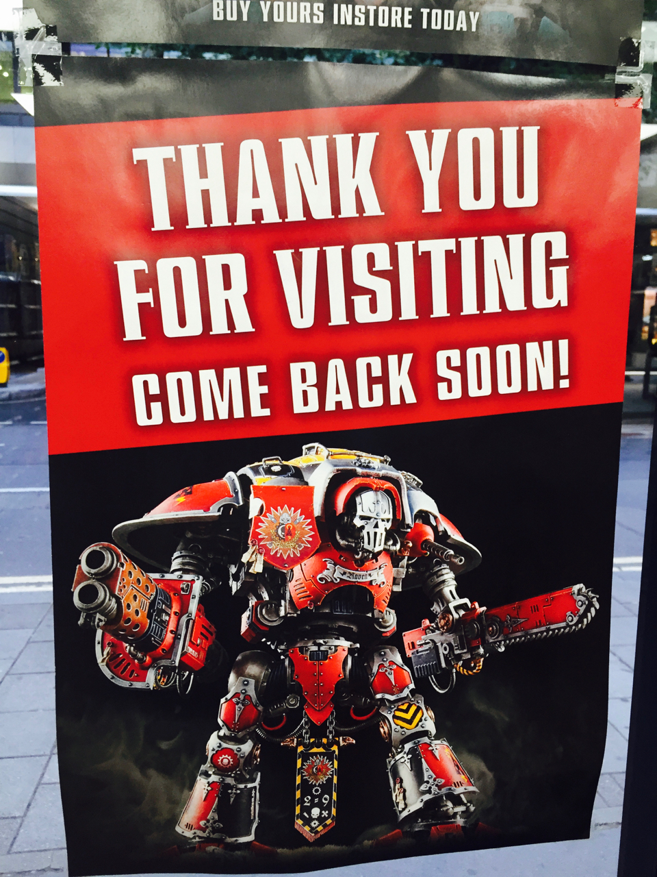This sign seen by shoppers as they leave a Warhammer store is as much about promoting the business as it is appreciating the visit. It fits the business and promotes one of the characters available from the business.