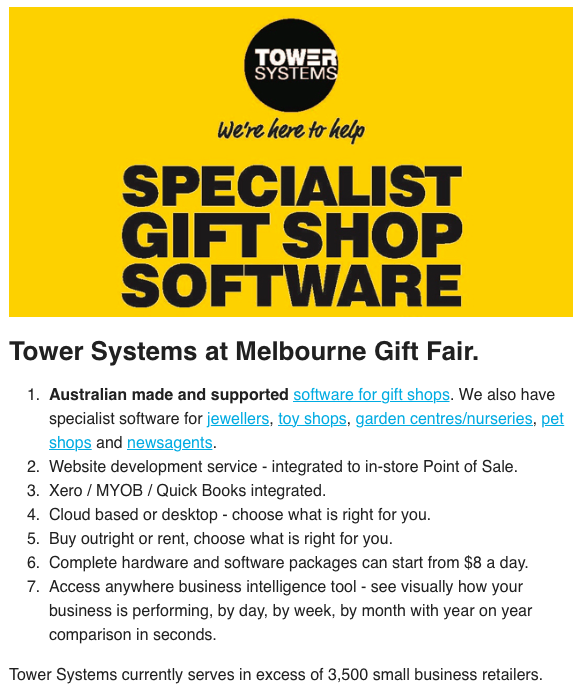 My software company has been exhibiting for years. It has been invaluable in connecting with gift and homewares businesses, and newsagents as they transform fro the old to new. I have seen some tremendous transformations.