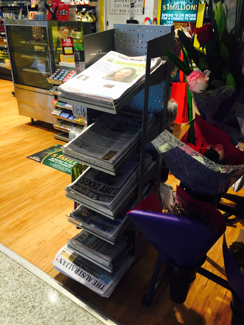 If you are ever at Sydney airport, check out this slim newspaper stand at the c-store on the ground floor level of the nanas terminal, next to the baggage carousels. While it is not attractive, it is ideal for the job: small footprint, easily moved and able to hold stock on the bigger newspaper days.