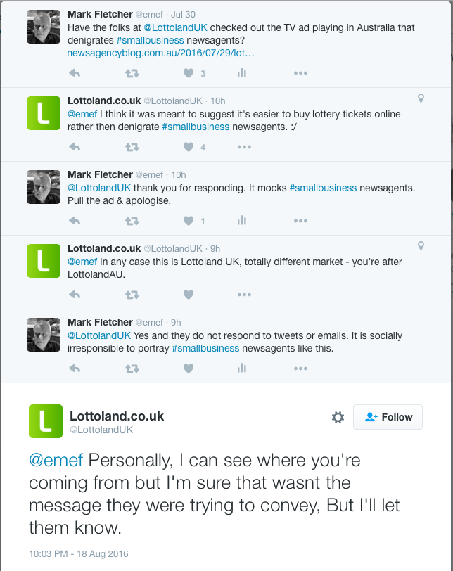 I think it’s a bit harsh to demand pulling the ad and apologising. This sort of tactic is just Advertising 101 (i.e. “talk down your opposition”). And to be honest it doesn’t make me (a mere customer) feel any lesser towards a newsagent or small business. At the same time I am no more interested in Lotto Land than I was before (which is zero).