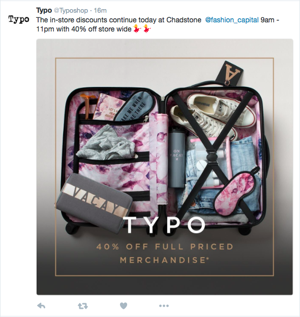 Typo hit Twitter just now promoting a 40% store wide discount at their Chadstone, Melbourne, store today.