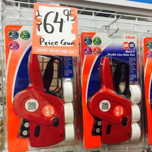 I’ve not bought a price gun for years so this may not be a good deal. At an Officeworks in Sydney this week I noticed this price gun being pitched near the sales counter – $64.95 for the Quik Stik gun and labels. I can’t recall seeing a piece gun on display at Officeworks before.