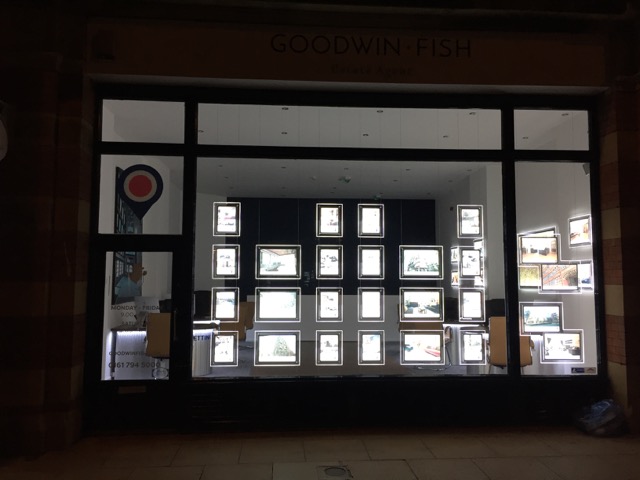 What does your shop look like when you are closed? Smart lighting and a good window display can help your closed hours be profitable. I saw the different smart lighting can make last week in Manchester in the UK. Here is a photo of a real-estate agency on Deansgate: