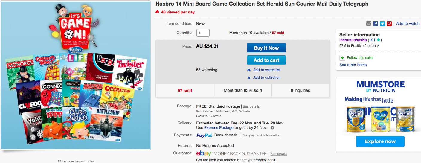 I was surprised to see many eBay sellers offering the recent News Corp. Hasbro Board Games including this one that has sold 57 units so far.
