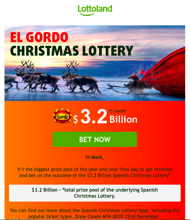 The $3.2B Lottoland prize ·December 21, 2016 ·Mark Fletcher ·0 Comments Lottoland is emailing daily this week. here is their latest – promoting their El Gordo related play. 3 likes Lotteries Leave a Reply Cancel replyYour email address will not be published. Required fields are marked *Name * Email * Website Enter Code * Captcha Comment * Δ Post navigation Next ArticlePrevious Article