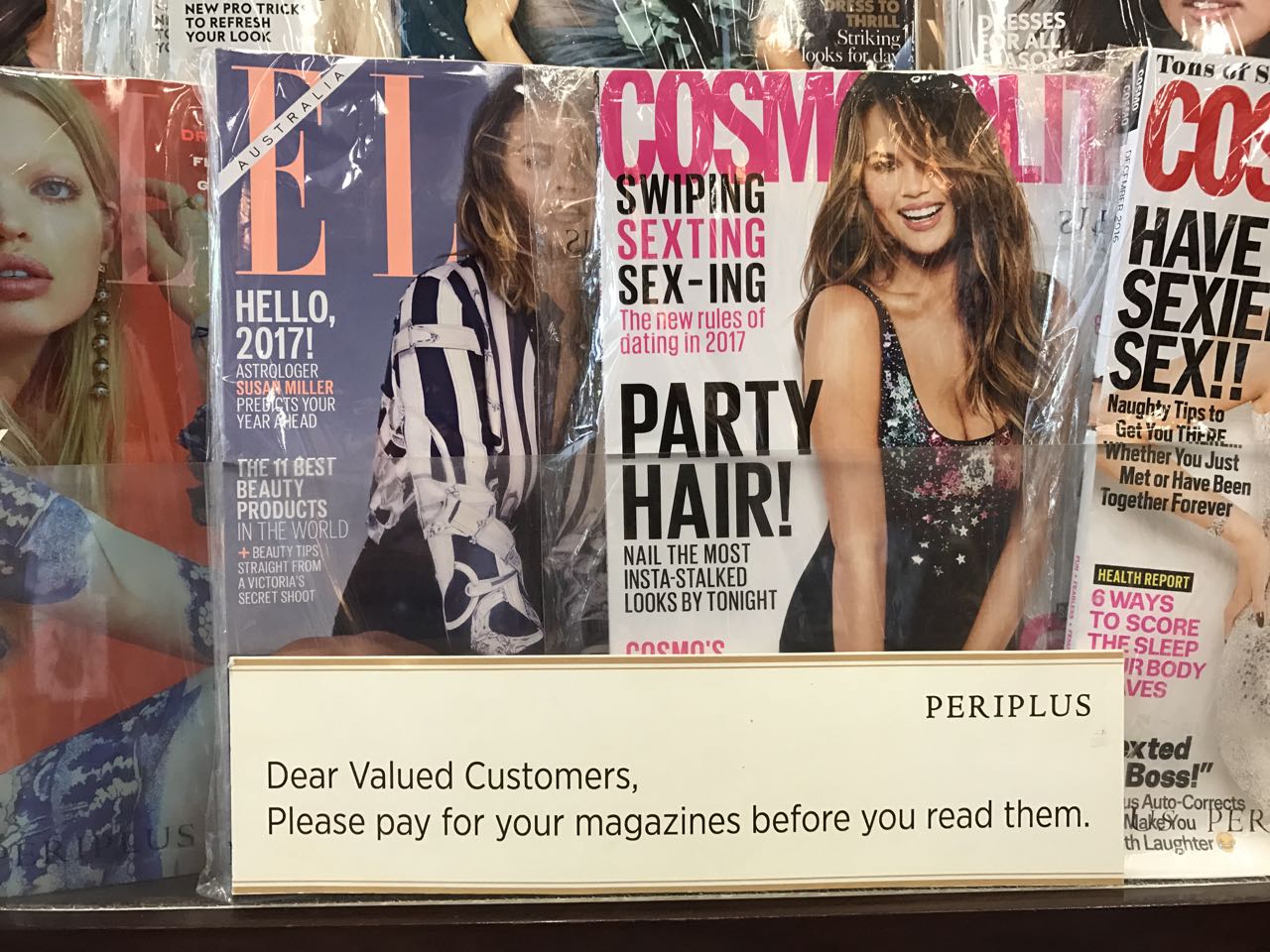 No browsing of magazines: pay before you read ·January 7, 2017 ·Mark Fletcher ·0 Comments This bookshop / magazine shop in Bali has these signs on each magazine display unit holding more than 800 titles. 6 likes magazines Leave a Reply Cancel replyYour email address will not be published. Required fields are marked *Name * Email * Website Enter Code * Captcha Comment * Δ Post navigation Next ArticlePrevious Article
