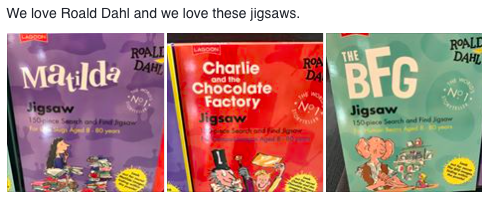 Leveraging the Roald Dahl interest ·February 8, 2017 ·Mark Fletcher ·0 Comments We have been leveraging the TV campaign by News Corp. promoting the Road Dahl books sold with newspapers by promoting other Roald Dahl product. This image is a Facebook post we used. We have done more in-store with these terrific jigsaw products. 1 likes Gifts Leave a Reply Cancel replyYour email address will not be published. Required fields are marked *Name * Email * Website Enter Code * Captcha Comment * Δ Post navigation Next ArticlePrevious Article