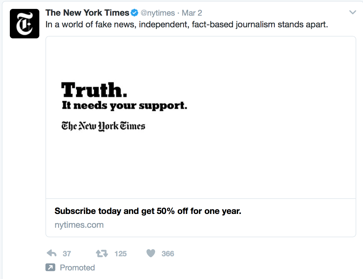 Excellent ad from The New York Times ·March 7, 2017 ·Mark Fletcher ·0 Comments Simple and timely. This is the type of ad from a newspaper publisher I trust that gets my attention: The New York Times is one of the outlets I subscribed to following the inauguration of Donald Trump as president of the USA. 1 likes Newspapers Leave a Reply Cancel replyYour email address will not be published. Required fields are marked *Name * Email * Website Enter Code * Captcha Comment * Δ Post navigation Next ArticlePrevious Article