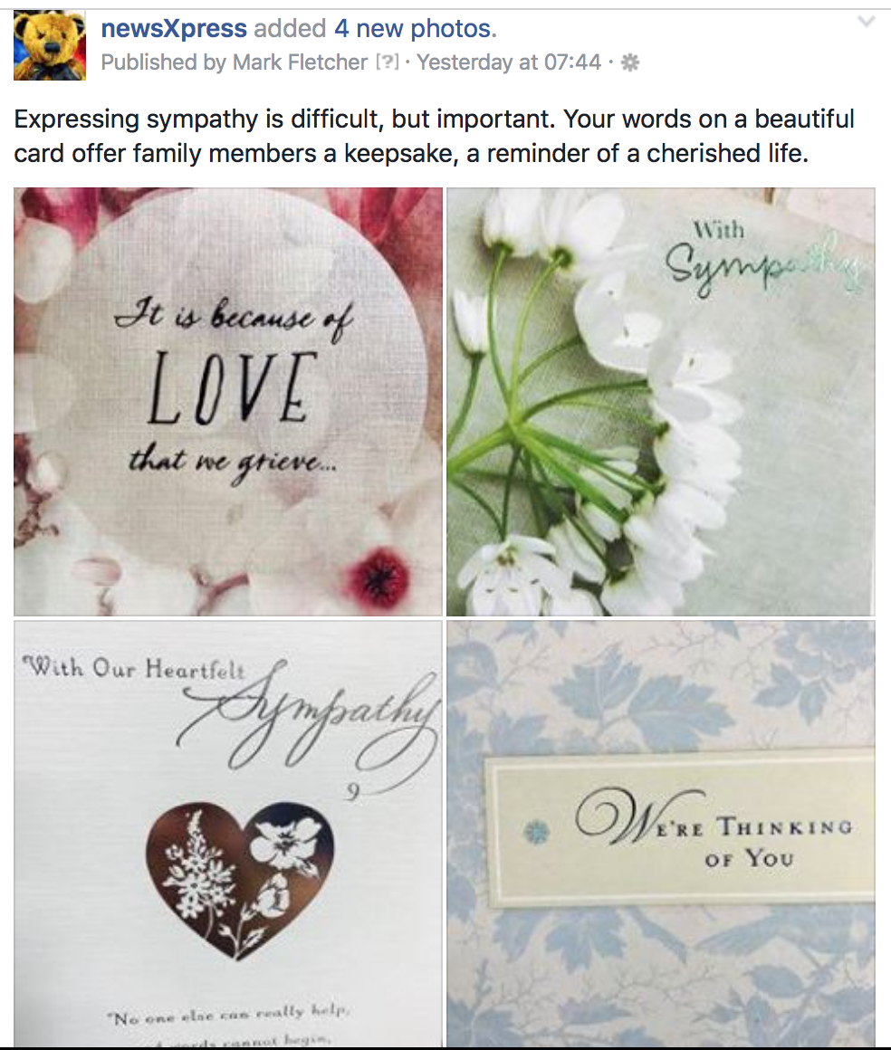 Here a post I did recently along the lines of what I am proposing here. It pitches sympathy cards. It achieved engagement from more than 1,000 people. As you can see it is easy to choose good content, write a short post and get it live for shopper engagement. A small $$ boost on facebook can help you reach beyond your own regular community.