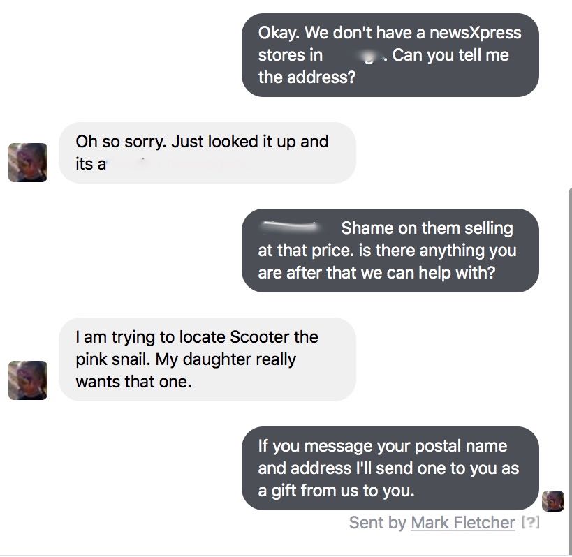 I was contacted through Facebook yesterday by a shopper complaining that an item sold online by newsXpress for $9.99 was being sold for $12.95 in a local newsXpress store.