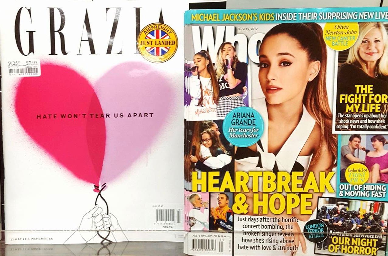 Magazines handle the Manchester terrorist attack ·June 8, 2017 ·Mark Fletcher ·0 Comments Grazia from the UK and Who from Australia are placed together on the shelf today covers related to the Manchester attack and the aftermath. Both magazines lend themselves to out of store promotion on social media. 3 likes magazines Leave a Reply Cancel replyYour email address will not be published. Required fields are marked *Name * Email * Website Enter Code * Captcha Comment * Δ Post navigation Next ArticlePrevious Article