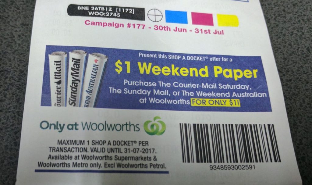 A newsagent in Brisbane was asked to honour the price on this Woolworths coupon for News Corp. newspapers: