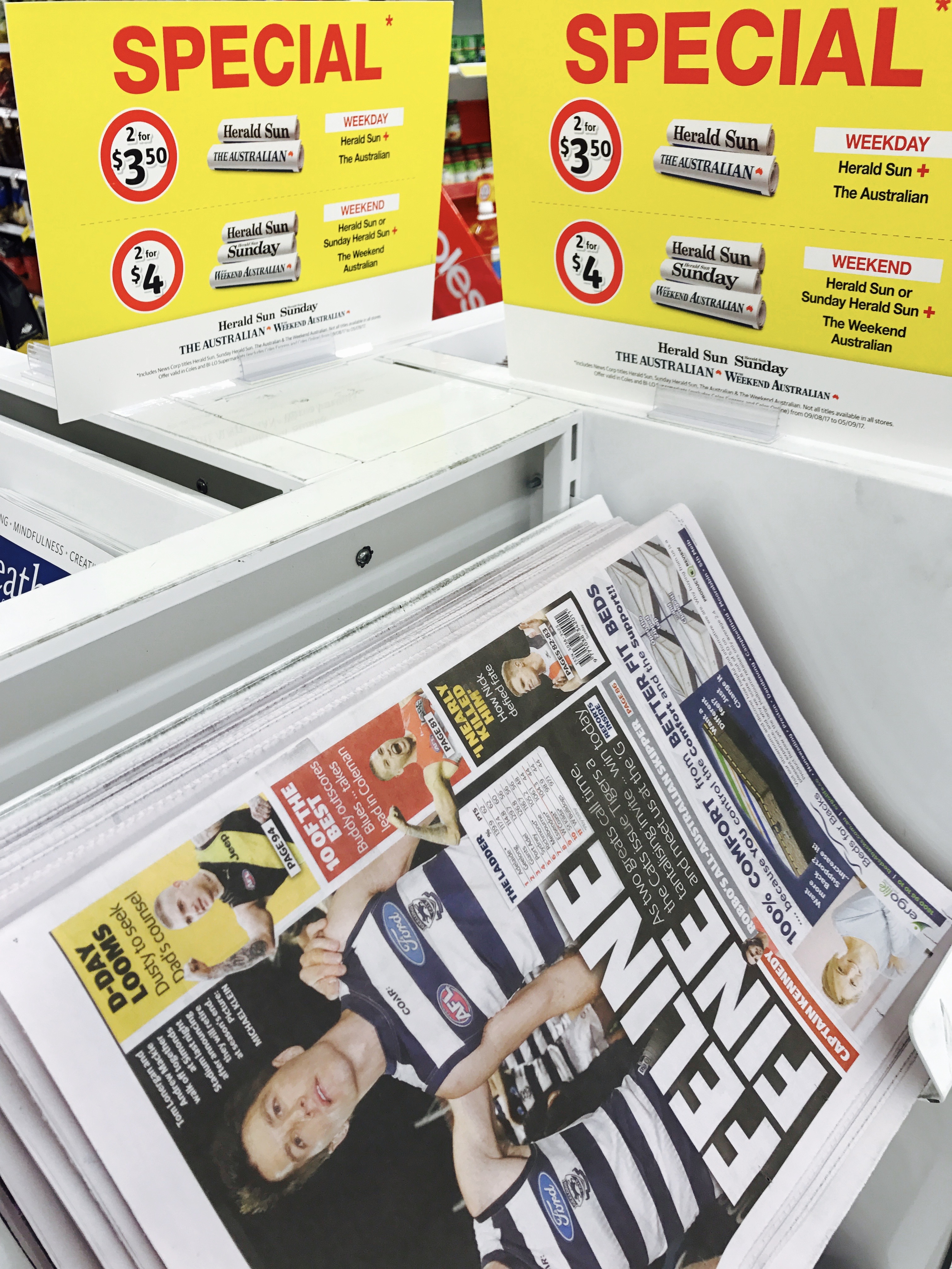 Check out how Coles is promoting discount newspapers from News Corp. at the moment. I hope News Corp. does not do for newspapers what Bauer did for magazines by making discount bundles the new normal and educating customers to expect them.