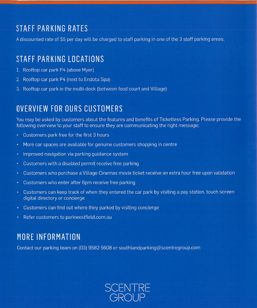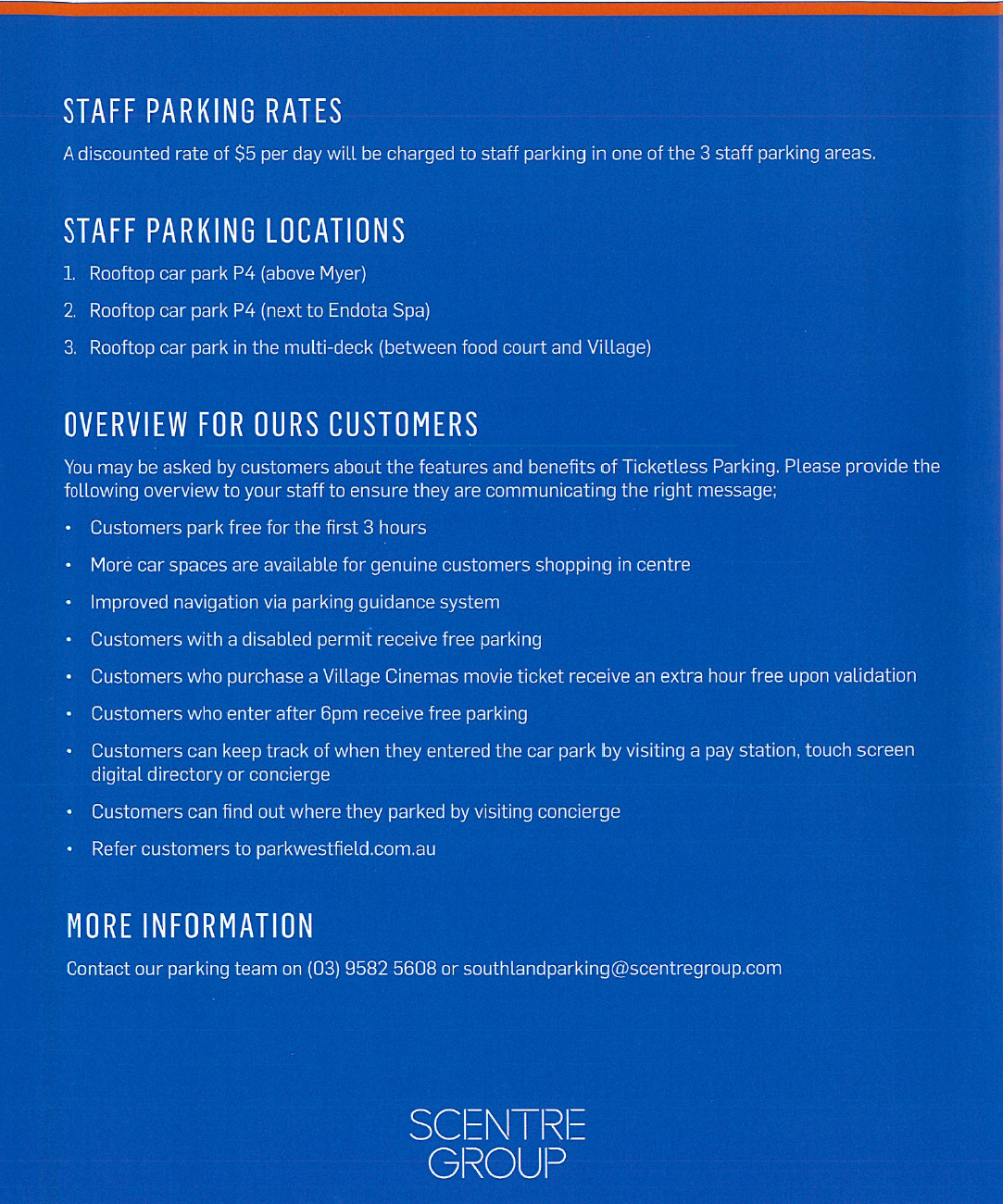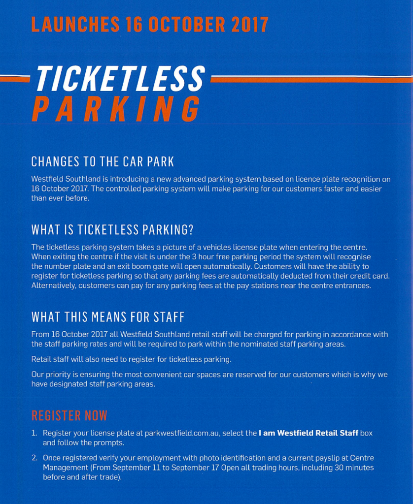 Here is the announcement from Westfield yesterday to business owners and employees at their Southland centre. This move to charge for parking is a tax of retail workers and a tax on small business owners.