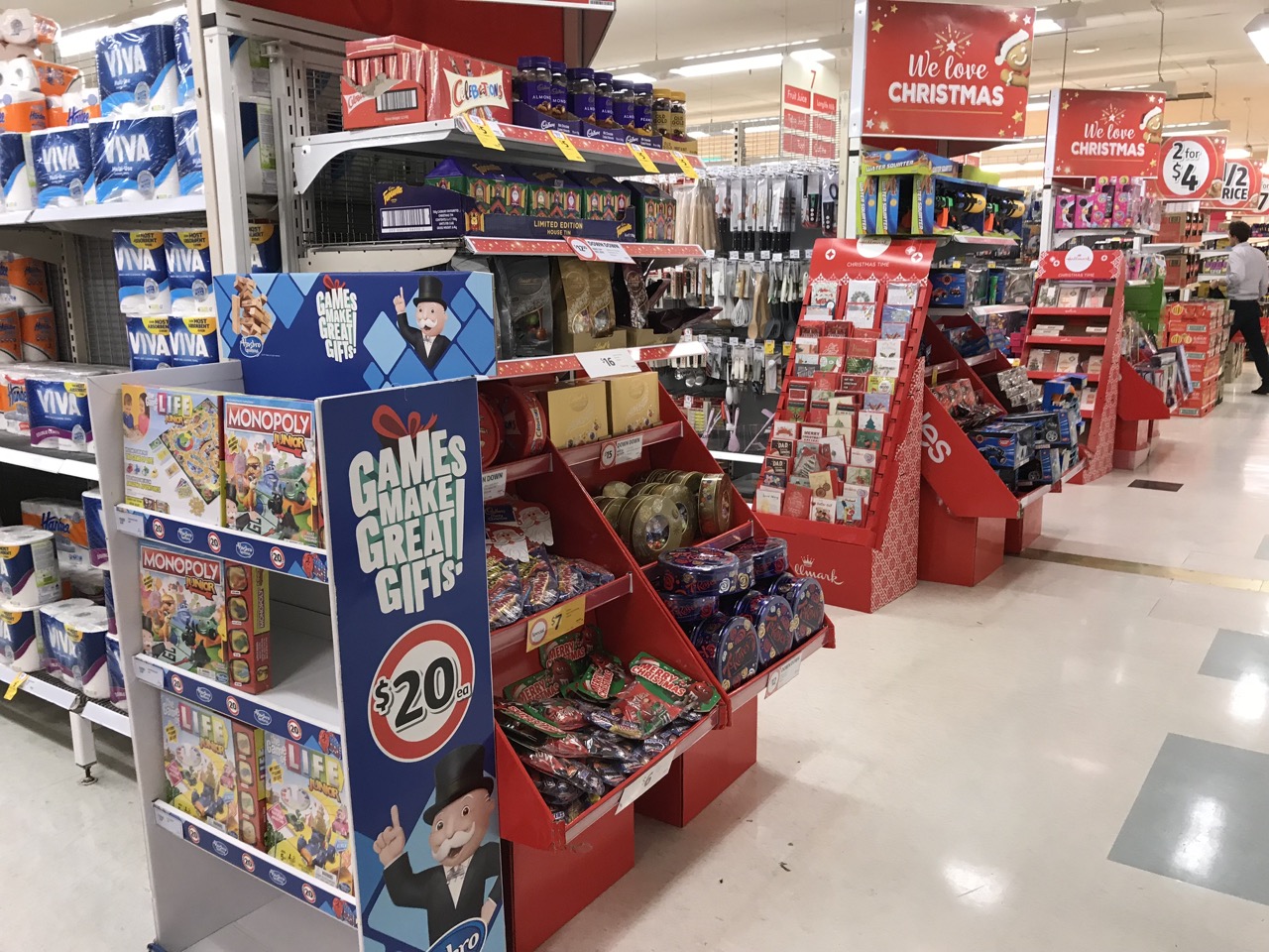 At my local Coles supermarket they are leveraging destination shopping with key Christmas items capping major aisles. In this photo you can see three such placements: games and two card stands.