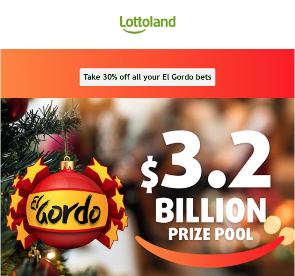 Lottoland 30% discount pitch ·December 22, 2017 ·Mark Fletcher ·0 Comments Lottoland has been emailing its marketing list with an offer of 30% off for the El Gordo $3.2B prize pool game. Crazy. 0 likes Competition Leave a Reply Cancel replyYour email address will not be published. Required fields are marked *Name * Email * Website Enter Code * Captcha Comment * Δ Post navigation Next ArticlePrevious Article