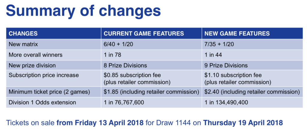 The first big change to powerball was in 2013 when the drawn numbers went from five and the PB to six and the PB and now barely five years later yet another change from six and PB to seven and the PB…As usual with these changes you get a massive price hike in the cost of a ticket…initially bigger jackpots will drive sales but once a big jackpot goes off surely sales will slump the following weeks…But the biggest put off for many customers in my opinion will be the huge price hike for each ticket and the small returns from divisions 4 to 9…Like oz lotto don’t be surprised if many people stop playing powerball…THE TATTS group better not make big changes to Saturday lotto which has remained more or less the same since it began in Victoria in 1972…oh boy am i getting old..