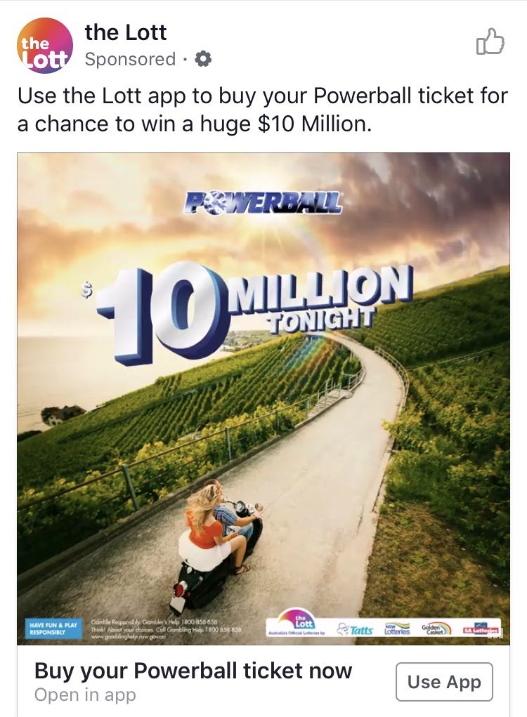 Tatts promoting app purchase for Powerball $10M tonight ·March 1, 2018 ·Mark Fletcher ·2 Comments No pitch for the retail network anywhere in this online ad. 7 likes Lotteries Join the discussion Factory Worker March 1, 2018 Also what a pity that they use an image of people on a motorbike who aren’t wearing helmets. 1 likes Michael March 1, 2018 That actually made me laugh, Kudos. Tatts isn’t very good at using imagery it seems as they are just very lazy with their promotional materials. 0 likes Leave a Reply Cancel replyYour email address will not be published. Required fields are marked *Name * Email * Website Enter Code * Captcha Comment * Δ Post navigation Next ArticlePrevious Article