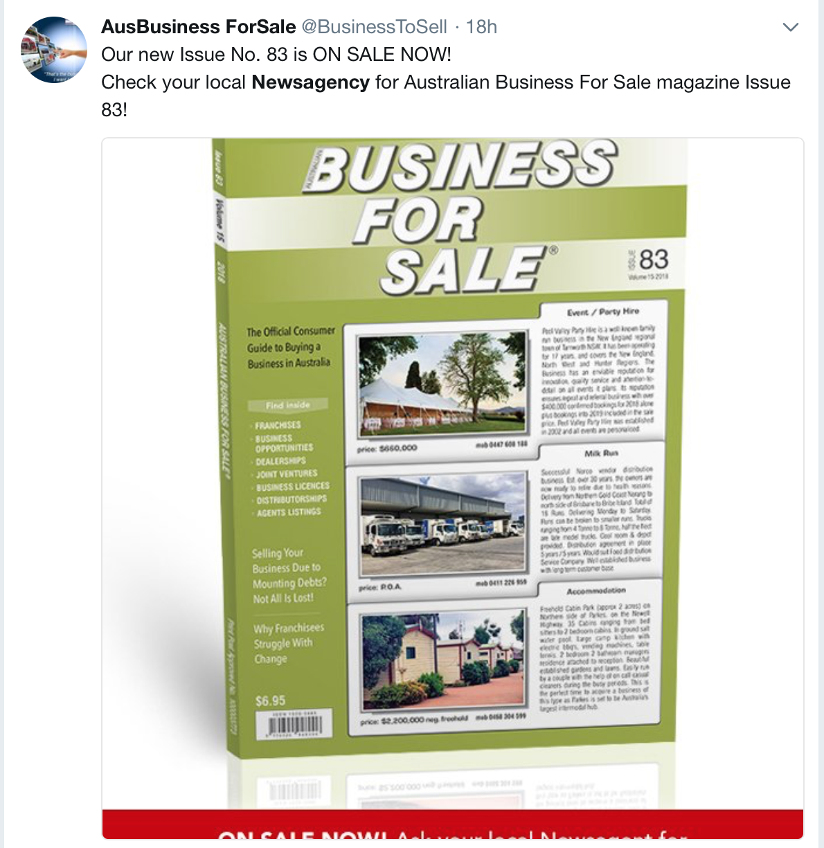 Australian Business For Sale magazine promotes newsagents on Twitter ·March 19, 2018 ·Mark Fletcher ·0 Comments 0 likes newsagency marketing Leave a Reply Cancel replyYour email address will not be published. Required fields are marked *Name * Email * Website Enter Code * Captcha Comment * Δ Post navigation Next ArticlePrevious Article