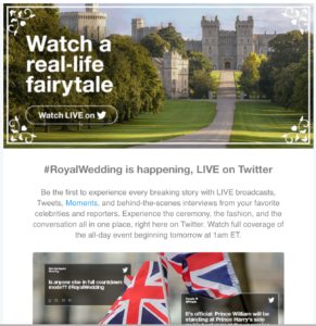 Twitter is leveraging the royal wedding to show off its platform not only for serving individual tweets but bringing together coverage for what is an international event. What they will be doing later today shows how far this platform has come and, through this, challenge the relevance of newspapers for reporting news, which is usually old news.