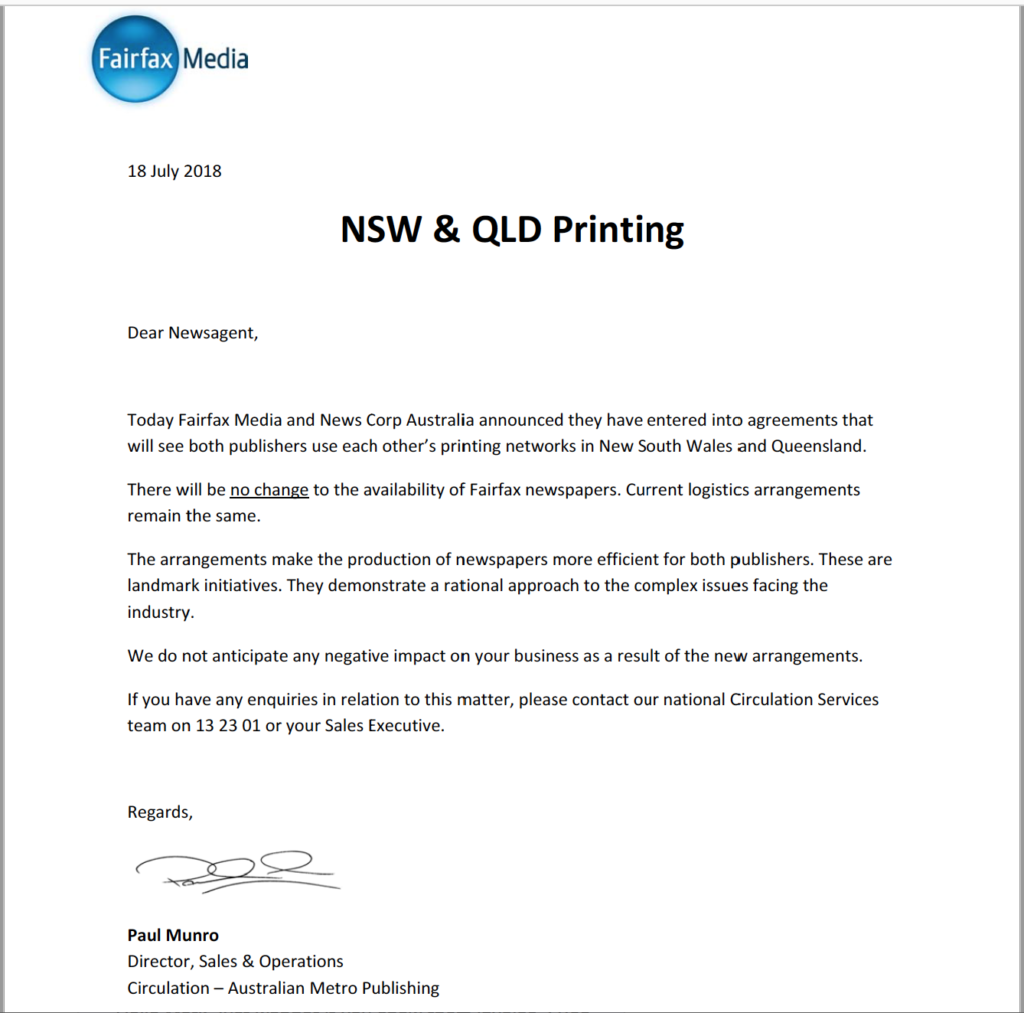 Fairfax and News Corp. to share printing networks in NSW & QLD ·July 18, 2018 ·Mark Fletcher ·5 Comments Fairfax today announced to newsagents today plans for Fairfax and News Corp. to share their printing networks in NSW & QLD: 6 likes Newspaper distribution Join the discussion PAT. E July 18, 2018 Yeah, Na cant see that going pear shaped 2 likes Jenny July 18, 2018 Makes sense, they already share delivery trucks. Next best thing Fairfax could do for us is combine spectrum with Sats SMH so we just get 1 paper to roll, not 2. Would have to save them money if they didn’t have to deliver spectrum on Friday. 0 likes Colin July 18, 2018 20 years too late. Makes no sense to leave distribution separated. 0 likes Graeme Day July 18, 2018 There is no other choice. 0 likes Colin July 22, 2018 I was told that it seems a go slow in Chullora NSW is happening since announcement has anyone else heard something on these lines? 0 likes Leave a Reply Cancel replyYour email address will not be published. Required fields are marked *Name * Email * Website Enter Code * Captcha Comment * Δ Post navigation Next ArticlePrevious Article