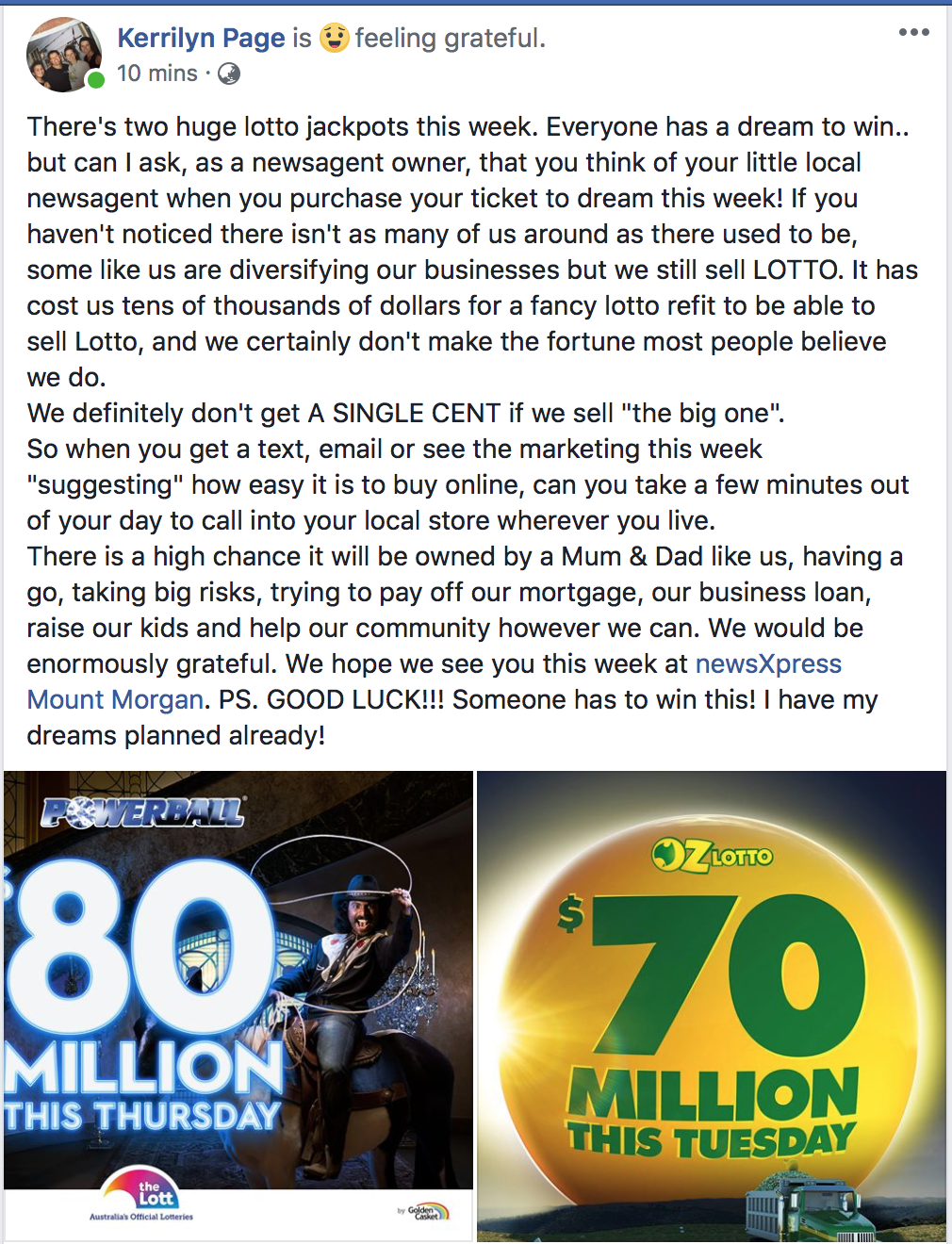 I love this Facebook post from Kerrilyn Page at newsXpress Mount Morgan explaining the importance of buying lottery jackpot tickets through your local small business newsagency. It frames the challenge of online and the importance of shopping local well I think. I also love the optimism of dreaming for the win.