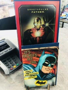 We have tried different cards, these two have worked the best at this retail location. The Batman card in particular is loved by shoppers. Inside, it is an homage to the original comic and TV series.