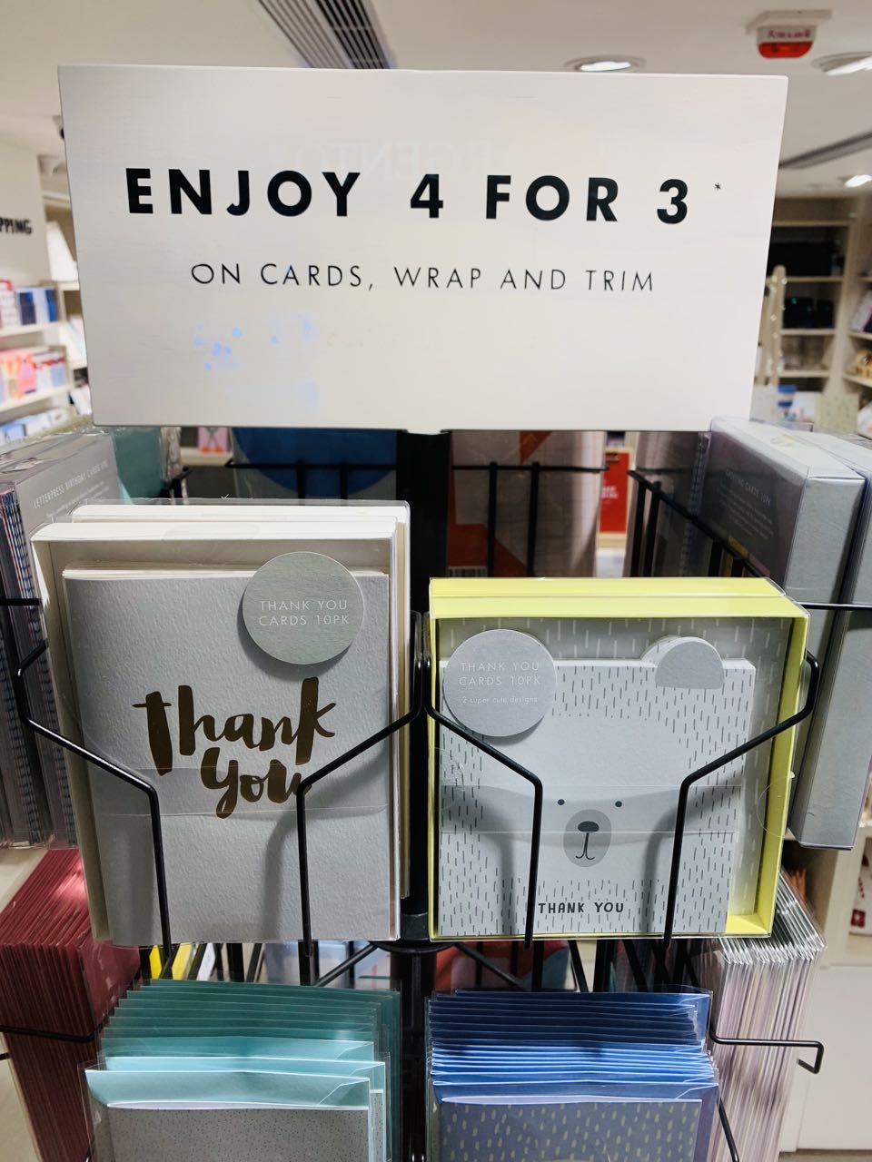 While Kikki-k has always priced cards to appear to offer a discount, the buy 3 get 4 pitch feels new. I can’t recall seeing it before.