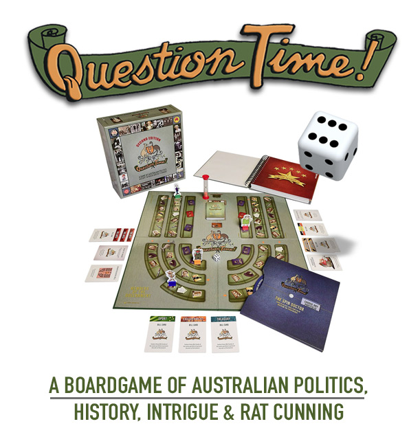 I have been approached by the makers of Question Time!, an Aussie game built around the theme of question time in parliament. Here is all the information they provided me: