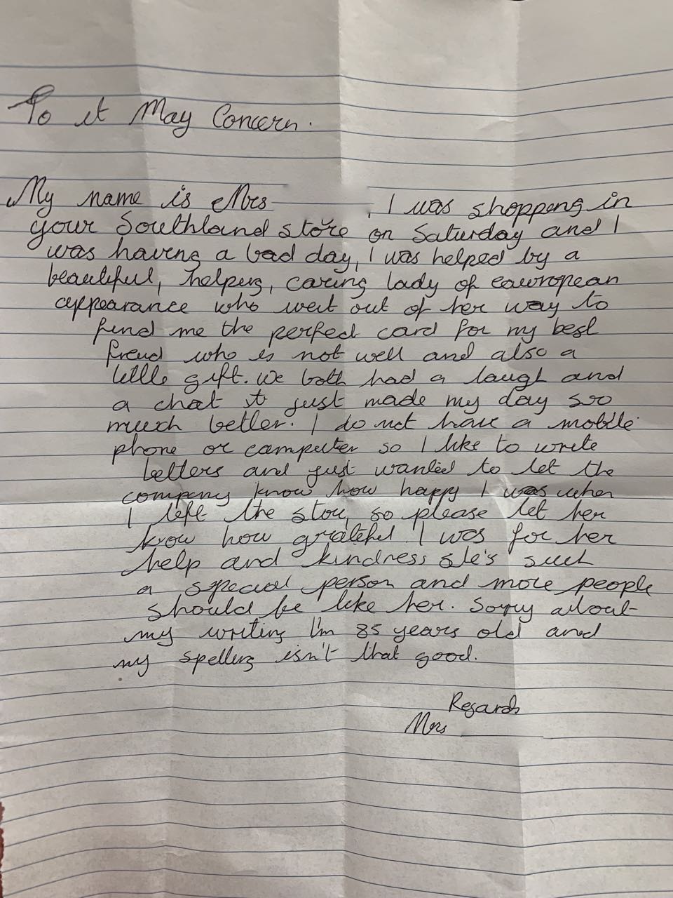 We received this at the office a couple of days ago. It’s a letter from a customer of newsXpress Southland. I am grateful they sent it and grateful for the team member involved.