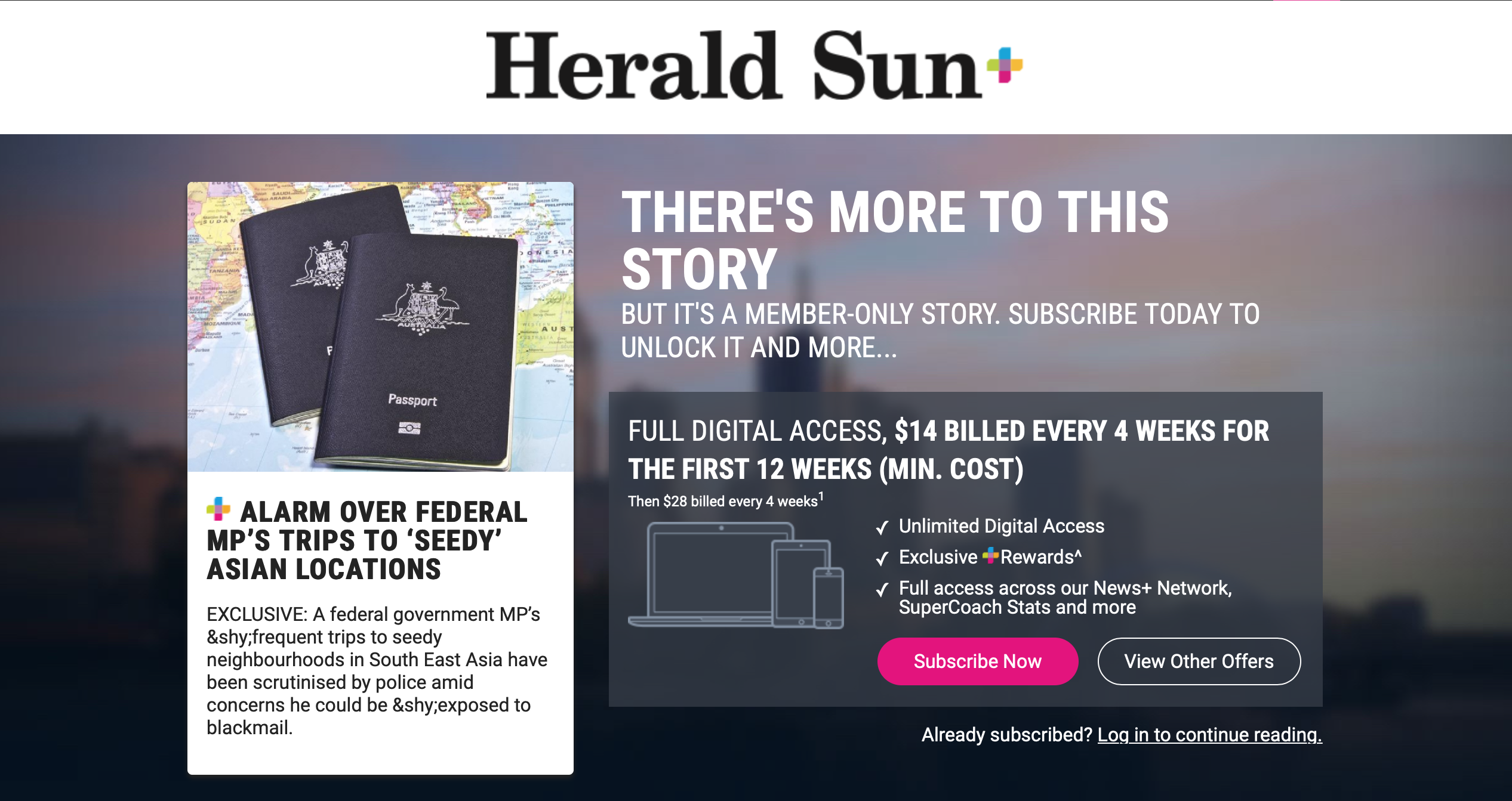 Take this Herald Sun exclusive story from today. They want me to sign up to a subscription. The cost outweighs the benefit I see in accessing the story. So, I will wait to find out more about the story.