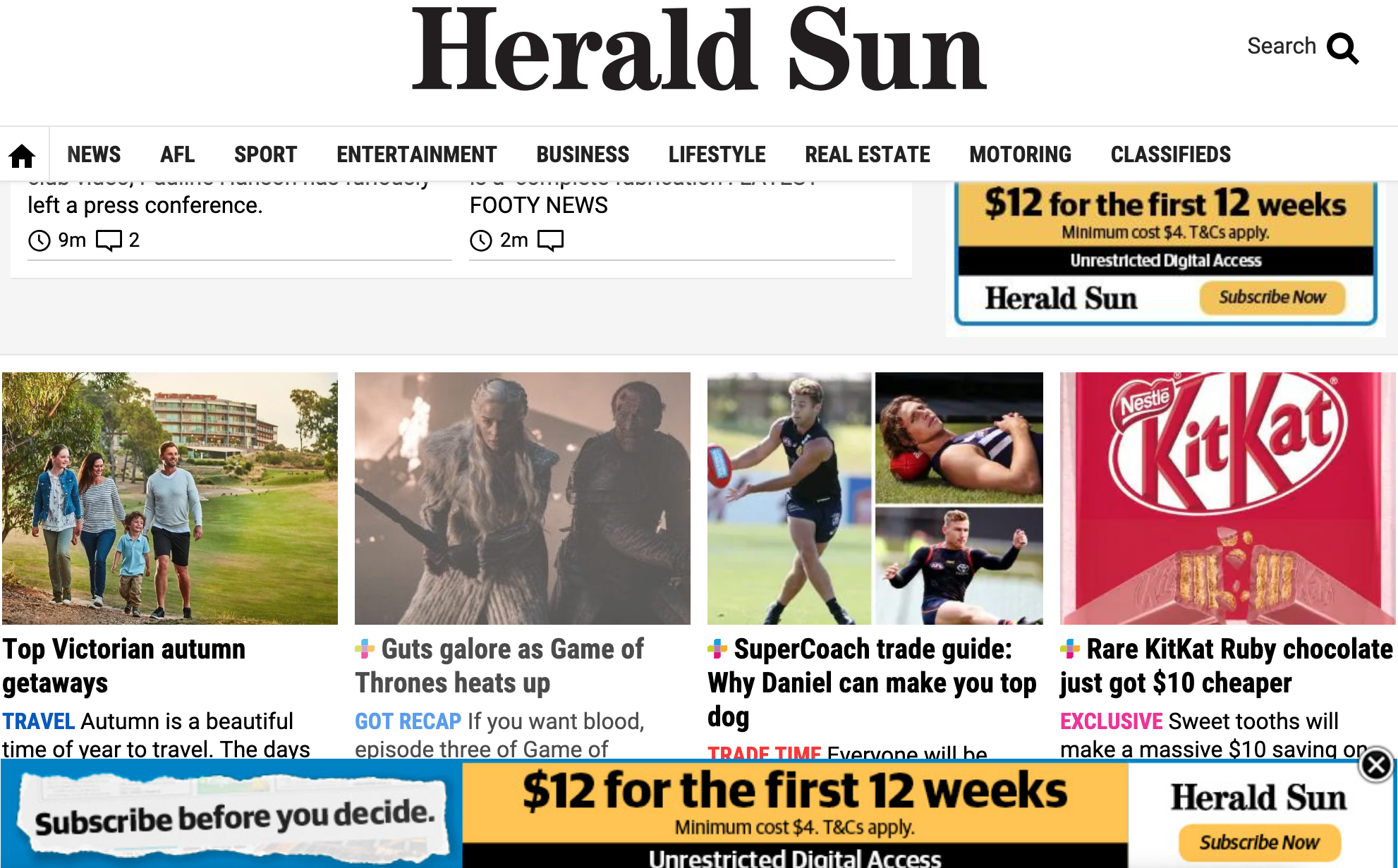 The News Corp websites give over plenty of screen real estate for their subscription promotions. The two pitched on he Herald Sun website are a good example. each pitched their $1 a week starter digital only promotion.