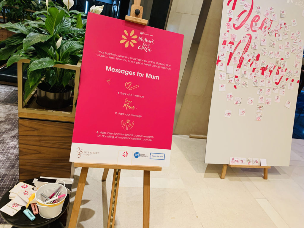 The Hilton Hotel is Sydney has this wall for messages people can leave about / for their mums. It is part of an awareness and fundraising campaign for the Mother’s Day Classic, an event in support of Breast cancer research. This display is setup in the foyer of the hotel.