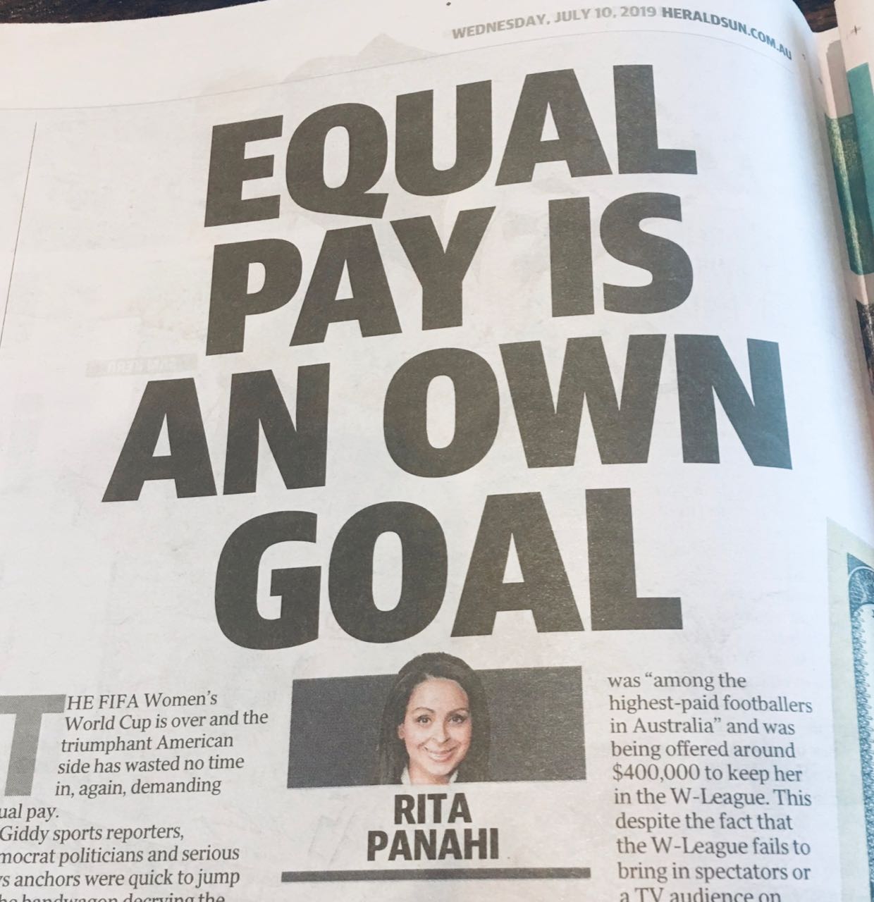 Some days I wonder why people pay to be yelled at by commentators like Rita Panahi in News Corp. newspapers. ·July 10, 2019 ·Mark Fletcher ·4 Comments This, today, by Rita Panahi is stupid. It should not have made it into the paper. 9 likes Social responsibility Join the discussion Lance July 10, 2019 I haven’t read the article, but I guess all that space up the top helps her to fill the page if she’s got nothing to say………… 3 likes Leon Tonna July 11, 2019 USA womens team receive 13% of low revenue USA mens team receive 7% of high revenue Simple – increase revenue – increase pay Just like a Newsagency. 6 likes Baz July 13, 2019 Spot on Leon….Those are the facts.. 1 likes Mark Fletcher July 13, 2019 The Panahi commentary is not quite about the issue now being debated in this thread. On that actual issue on pay, it is more complex than headlines. Here is a good article, which cites sources: https://www.politifact.com/truth-o-meter/article/2019/jul/11/does-us-womens-soccer-team-bring-more-revenue-get-/ 0 likes Leave a Reply Cancel replyYour email address will not be published. Required fields are marked *Name * Email * Website Enter Code * Captcha Comment * Δ Post navigation Next ArticlePrevious Article