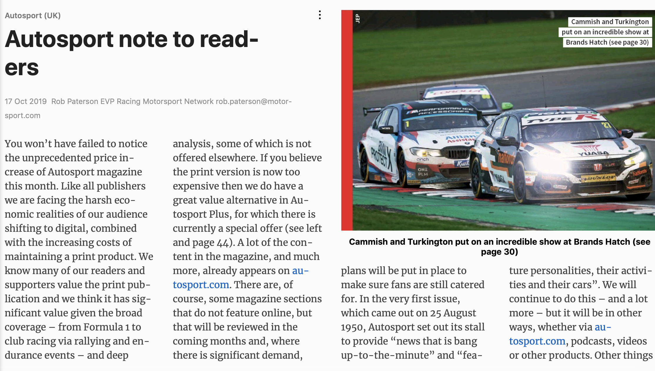 The cover price for the UK Autosport magazine has been more than doubled for over the counter purchase in a move that appears designed to drive migration from print to online.