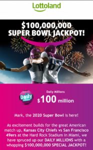 While politicians have patted themselves on their backs for ‘fixing’ the Lottoland betting model, Lottoland is still in business as this Super Bowl promotional email shows. This must be frustrating to lottery retailers given how Lottoland mocked them in their TV commercials.