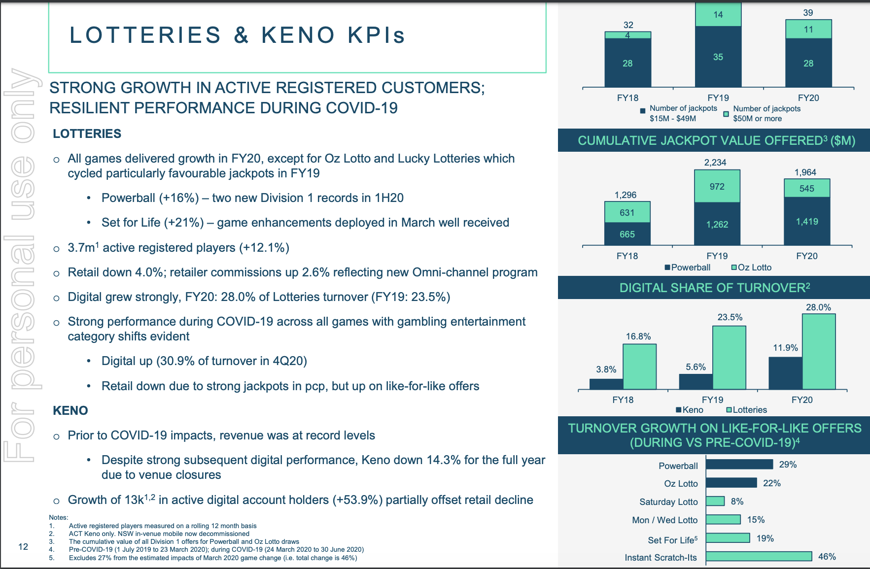 Growth in revenue overall for Lotteries and Keno was 1.8%. Growth in digital was up 19% on the previous year. I guess that puts a different light on their reasoning for the 4% decline in retail revenue noted in the report. While retail closures would have impacted, I’d be surprised if closures accounted for a major portion of the decline given that newsagencies were not required to close.
