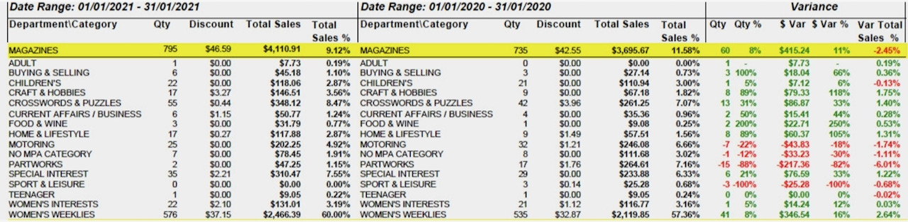 Check our this magazine sales data from a regional newsagency for January, reflecting excellent year on year growth in January 2021 over January 2020.