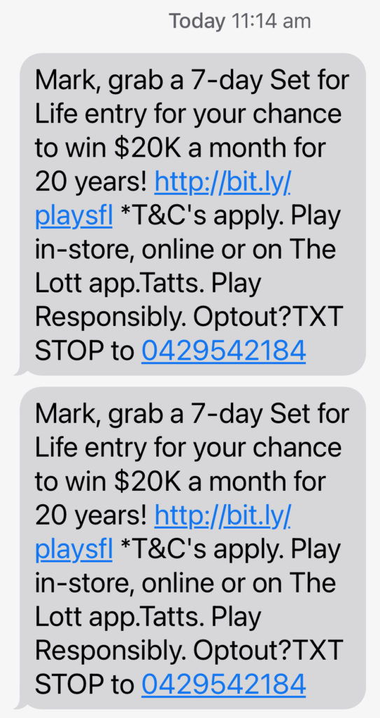 I received these two text messages Friday morning from Tabcorp. While they do mention in-store purchase in the text message, the link, of course, if for online purchase.
